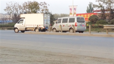 随后,记者来了该路段的交会处。在现场,记者看到为了方便车辆从人民路进入外环路,这里特意留了一个出口。就是在出口的南侧有一小段护栏残缺不全,粗略看了一下,这段毁坏的护栏大概有二十米,坏的部分只剩下了五根立柱立在路中间的水泥墩上。这五根立柱有一根有些倾斜,立柱顶部还有些螺丝口空着。为了提示过往车辆,有人把这几根立柱用彩虹条给连了起来,做了个标示,以防有车主没有留意而提前拐弯。