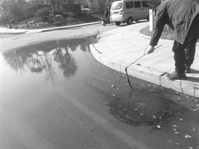 “不是下水道里面的污水,不然也不可能没有气味。”一路过的市民告诉记者,积水下面的窨井里是自来水管道,他怀疑是管道破损,导致大量清水流不出去才外溢到马路上的,由于积水有半年之久了,青苔堵住了外溢口,所以积水少了很多。