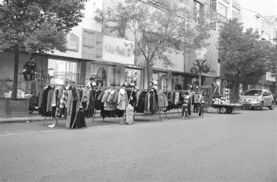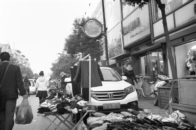 停在路边的汽车遭到地摊的“围堵”