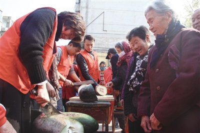 今年冬瓜大丰收,可由于价格太过便宜,很多瓜农不愿花运费及人工费将冬瓜运到市场进行出售,而是将大量的冬瓜留在地里,任其变坏腐烂。近日,薛城区龙泉社区的工作人员联合该区义工,为小区的住户们送上了免费的冬瓜。