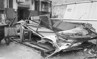 在赵先生居住的单元楼下堆放有一些废旧家具、广告布等易燃杂物。赵先生表示,这些闲置的杂物堆放在此处已经很久了,而且旁边又是居民扔垃圾的地方,一旦有人不注意扔个烟头,引发火灾后果将会不堪设想。