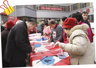 日前,枣庄市群众艺术馆的工作人员邀请我市多位书画艺术家,来到市中区立新小区为喜欢书画的爱好者进行了指导,同时现场挥笔泼墨,为小区居民送上多幅迎新“福”字和对联。 (记者 刘一单 摄)