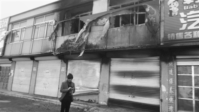 17日凌晨四点,市中区福瑞花园大门东侧的一家两层商铺发生火灾,一旁商铺的工人说,“当时火势比较凶猛,在场的围观者猜测起火原因应为电路短路所致。所幸,店主及时逃生,店内物品全部被烧毁。” (记者 王龙飞 摄)