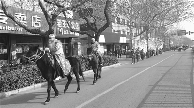 18日,在市中区文化路,两个身着古装骑着高头大马的人走在非机动车道上,后面跟着一排高举广告牌身着古装的工作人员,活像电视剧里状元衣锦回乡的场景。市民对此褒贬不一。 (记者 刘一单 孙雪 摄)