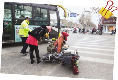 26日,在市中区文化路和振兴路路口,一位骑电动车的女士不慎摔倒,电动车压在了身上,执勤的交警和路人见状,立刻把这位女士扶起来。