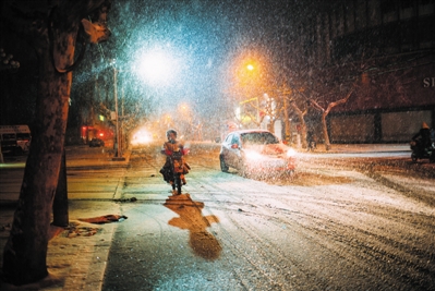 期盼了一冬的雪,终于飘落。昨晚,我市迎来首场大范围降雪,漫天飞舞的雪花,将城市银装素裹。瑞雪兆丰年,市民盼望这场雪能下得久些,让干旱了多日的枣城,痛痛快快地喝个饱。 (记者 马高超 摄)
