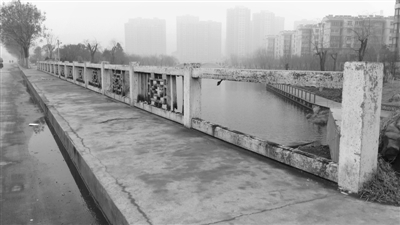随后,记者赶到了孙先生所反映的地方,在文化西路向北转弯不远处路东就看到一处栏杆,看样子栏杆存在时间很久了。栏杆金属部分大部分都已经生锈了,在大桥栏杆最南边已经有一个完全坏掉了,只剩下一个长方形的石头框架。再往北走,记者发现金属制成的栏杆生锈得特别厉害,很多竖着的栏杆底端已经断掉了,用手碰一下就跟着动,如果稍微使点劲这竖着的栏杆就会立刻断掉。正在记者采访时,一位市民领着孩子前来游玩,因为没有栏杆防护,小孩子把头伸了出去,桥下就是深达数米的西沙河,大人吓得马上制止。