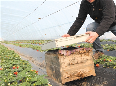 如今,棚内翠绿的地垄上娇艳欲滴的草莓就像专门摆放的一样整齐,高峰采摘期已到,棚内嗡嗡的蜜蜂唱着小曲迎接着每一位客人。
