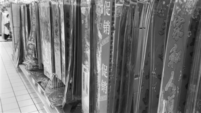 近日,记者走访市中区一些超市发现,春联已经出现在超市的醒目位置,但是很多市民在逛超市时,对于摆在眼前的春联“一点也不来电”,很少有市民驻足选购春联。