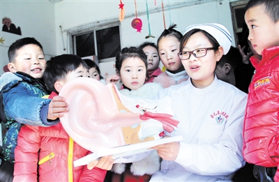 昨日,在台儿庄区一幼儿园,医务人员对照耳朵模型给孩子们讲解用耳卫生知识。为迎接3月3日全国“爱耳日”的到来,台儿庄区的医务人员,到驻地幼儿园,向幼儿讲解耳朵的生理结构,提高其保护听力的意识,养成安全用耳的习惯。