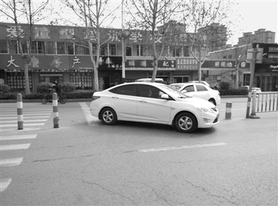 近日,位于市中区解放中路的一段道路隔离桩“不翼而飞”,让不少想要抄近路的机动车钻了空子。据附近商户表示,由于不少私家车从此缺口调头行驶,在上下班高峰期时这一路段经常造成交通拥堵。 (记者 苏羽 刘一单 摄)