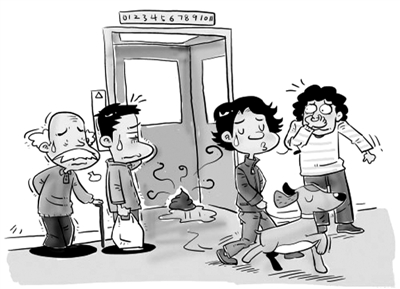 由于电梯的封闭式构造,狗的排泄物存留时间相当长,“不但臭味刺鼻,有时不注意还可能滑倒。如果把行李包放在地上,到家后就能看到包上蹭了很多狗尿,非常恶心。 ”朱先生抱怨道。