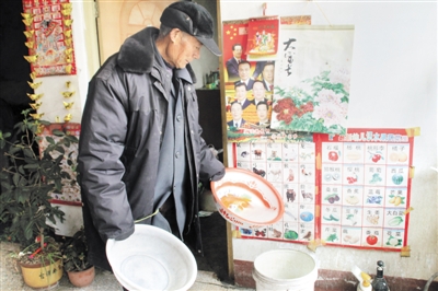 说到用水难给和尚寺人带来的不便,刘玉金老人说全村人对于用水都十分节约。早上刷锅水不舍得倒掉,等澄清后留着中午再刷锅用。平时洗脸洗手的水都倒进专门的水桶,留着给牲畜饮用。在刘玉金老人的家中,记者看到了十几个大大小小的水桶、水缸。不同的水桶盛装着干净程度不一的水。门外的树枝挂着刚刚洗净的秋衣,刘玉金告诉记者,这几件内衣还都是过年时穿的,这都将近一个月了,才舍得洗。“冬天穿的外套基本都舍不得洗,我这裤子还是今天为了接受你们采访刚换的。”他笑着说道。