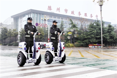 昨日,滕州市巡警大队的两名女警员驾驶新型警用巡逻代步车巡逻。该市巡警大队相关负责人介绍:“我们专门购置了这两台巡逻代步车,有利于扩大巡查范围,提升工作效率。” (特约记者 金亮 摄)
