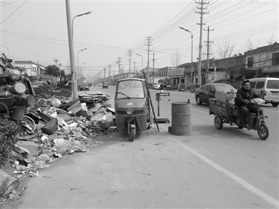 记者来到现场,看到路北侧一处院子里堆满了各种废品,院墙外回收的铁桶、铁架等堆了近两米高,一些纸箱和编织袋直接扔在非机动车道上。