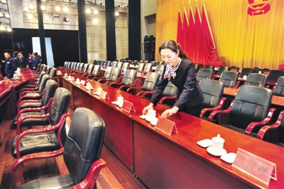 服务“两会”的姑娘们,统一着装,步履轻盈,举止端庄,动作娴熟地为委员、代表服务,犹如“两会”上的一道风景。