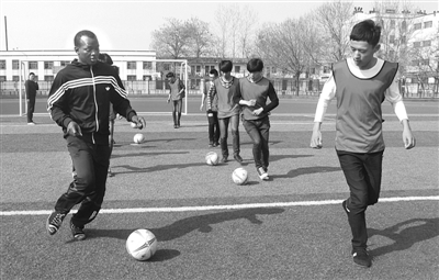 3月27日,来自喀麦隆的足球外教塔克来到滕州教学生们踢足球。为普及足球,该市日前开展了足球进校园活动,邀请外教对学生进行系统训练。