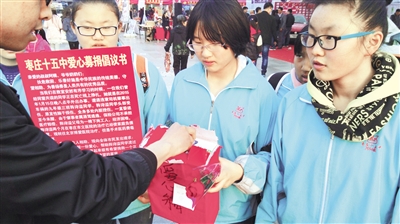 3月28日,在光明广场,枣庄市第十五中学的学生志愿者们手捧募捐箱,为他们的同学韩诗溢募捐。韩诗溢今年14岁,是十五中西校九年级三班的学生,两个多月遭遇车祸,令她至今昏迷不醒。 (记者 杨晓斐 摄)