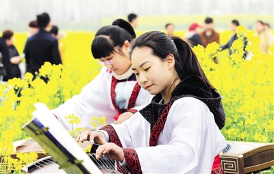 湿地花田现场,金灿灿的油菜花田错落有致,铺满视野;花田内木屋、大红灯笼等道具点缀其间,庆祝油菜花节的大型气球在空中飘荡;身着汉服的古筝、吉他表演者弹奏着优雅的曲子,为景区增添了浓浓的文化气息。游客们陶醉其中,不停地拿出手机、相机与花儿合影。除花田外,活动现场还开展了台儿庄生态湿地基地揭牌、千车万人绿色踏春游、汉服花间秀、乐器弹奏花间乐、学生“放飞梦想”等一系列活动。
