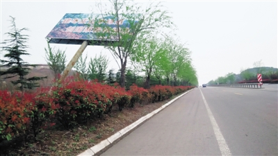 4日下午,在山亭区店韩路上,位于道路一旁的广告牌已经出现了严重倾斜,存在着一定的安全隐患。据附近村民说,该广告牌的倾斜可能与前几日的大风天气有关。 (记者 董艳 摄)