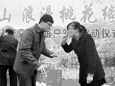 近日,“相约黄丘山 浪漫桃花缘”大型公益相亲会在美丽的“世外桃源”张山子福彩村开幕。相亲会通过趣味互动游戏、爱情表白等环节,为五十余名单身青年男女提供相识交流的平台,现场气氛活跃。活动结束时,有9对青年男女牵手成功。 (记者 邵士营 摄)