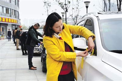 晚报讯 (特约记者 王雪纯 摄影报道)4月4日上午,滕州市荆河路海上明月小区停车场内,60多位私家车车主聚集在一起,举办了“黄丝带公益在行动”活动。车主们聚在一起,为自家的车系上黄丝带,市民看到系有黄丝带的车辆,便可以免费搭乘顺风车。