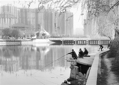 茂源大桥至荆河桥之间河道的东侧岸堤垮塌已久,管理部门为防止发生危险早已拉起防护网并设立了“禁止入内”的警示牌。3月29日一大早,数十人对警示内容置若罔闻,翻越防护栏入内垂钓。(特约记者 邵长富 摄)