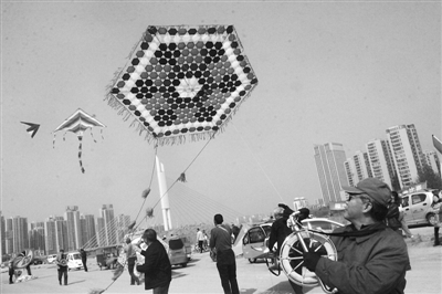 4月10日,在滕州市第五届老年人风筝比赛上,该市的60多位老年风筝爱好者参加了比赛,他们中年龄最大的78岁。他们所放的风筝都是自己动手制作的,最长的50多米,最大的8平方米。 (特约记者 侯志龙 摄)