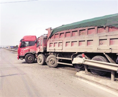 近日,在市中区文化路与东外环交会处,两辆货车发生碰撞,事故导致道路护栏被毁。据了解,事故原因是由于后车车速过快撞上前车,该事故导致两车受损,两人轻伤。 (记者 王萍 摄)