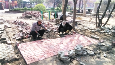 上个月,本报报道了市中区龙凤里小花园以及龙凤北里社区内的部分路面,因铺设热力管道后未对路面实施硬化导致道路难行的情况。13日,在小花园内,几位工人正忙着给地面铺设彩砖。一旁的负责人告诉记者,维修工作刚开始没几天,待小花园施工完毕后,再对龙凤北里社区的路面进行大修。 (记者 王龙飞 摄)