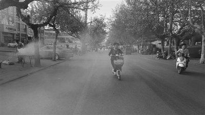 25日下午,在市中区振兴北路矿务局供应处新区附近。一名年轻男子正在点燃炉灶,产生的大量浓烟扩散到路面上,行人为了躲避,纷纷将车骑到机动车道上,增加了安全隐患。