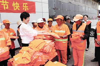 在“五一”国际劳动节来临之际,箭牌卫浴公司为辛苦美化环境的环卫工人送去了100套“爱心环卫衣”,对他们为城市美化付出的辛勤劳动表示感谢。 (记者 王萍 摄)