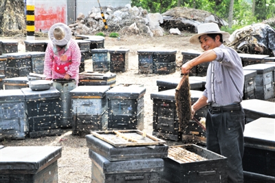 5月4日,放蜂人正在收蜜。随着槐树等树木花期的到来,吸引了江苏、安徽等地的放蜂人来山亭放蜂,村头、小溪边、山脚下都成为放蜂人的理想场所。