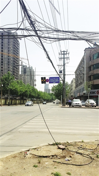 晚报讯 (记者 李帅 摄影报道)5月5日,家住市中区龙头西路附近小区的张女士拨打本报热线反映,位于市中区龙头路与华山路的西南角处有一根线缆垂落到地上,附近还有几根线缆下垂,看着粗粗的线缆不知道是干什么用的,就这样垂到地上感觉特别的危险。