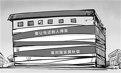 5月21日,湖北宜昌西陵二路拆迁工地,一栋即将拆除的居民楼上挂着“赖到最后一场梦,熬到最后一场空”、“要让先迁的人得奖”等多条征地拆迁标语。
