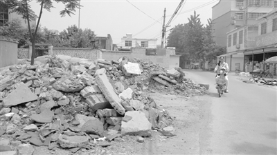 26日,在枣庄市社会福利院向北三百米邓元村内一条小道的西侧堆放了两堆建筑垃圾,十分显眼,占去了很大一部分道路。附近修车店店主说,建筑垃圾是北面的一户人家建房时堆下的,如今已经数月了,不知为何无人进行清理。