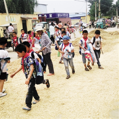 麦收时节,滕州市荆河街道荆西小学门口的马路成了打麦场,附近村民把麦子摊在学校门口的道路上,让过往的车辆碾压,严重影响了交通和学生的人身安全。