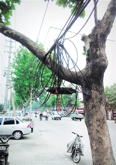 近日,在滕州市荆河西路原焦化厂区段,一团卷起的线缆吊着一个不知什么用途的仪器挂在行道树上,旁边就是人来人往的早点摊。摊主说:“线缆在这里好长时间了,路过的行人怕有危险,都绕着走,希望相关部门尽快前来处理。”