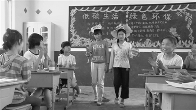 昨日,是以“践行绿色生活”为主题的第44个世界环境日。水泉镇东河小学开展变废为“美”创意活动,废弃的塑料瓶、易拉罐、报纸、挂历等物品,经过学生们的创意变成了笔筒、灯笼、帽子等手工艺品。 (记者 王晨曦 摄)