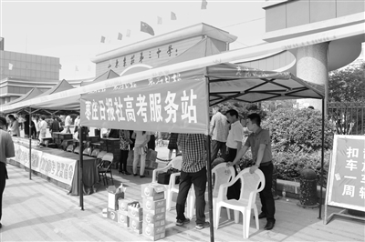 三中东校考点外,东湖明珠的助考点也是与众不同。桌前放了一个血压计,几位身着白衣的人在助考点忙碌着,旁边还放着一箱箱的矿泉水。“我们加了一个血压计,就是怕家长在等待考生的时候中暑、血压升高。”一位工作人员介绍说。
