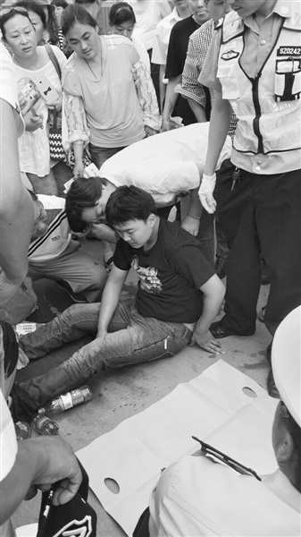 昨日下午数学开考前,考生小董骑自行车到三中西校考点应考。他车子刚停好,便“咚”地一声晕倒在地。现场的人都往小董处聚集,交警、家长、工作人员、热心市民送水的送水、遮阳的遮阳、扇扇子的扇扇子。5分钟后,120急救人员赶到现场对小董进行救治。在考点传达室休息了20分钟后,小董渐渐恢复清醒,准时走进了考场。