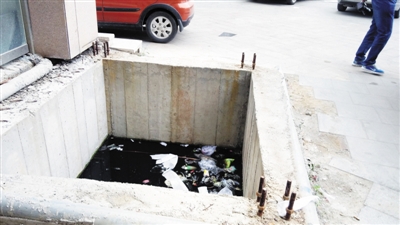 据介绍,因为电梯井没有任何遮盖,雨水存在井里,天长日久,水已经变质发臭。“电梯井是用水泥砌成的,而且井上面没有盖任何的东西,再加上里面有很多垃圾,现在天气渐渐热了,井里面的水散发出刺鼻的臭味,特别是一刮风,老远都能闻到。”在附近饭店工作的店员对记者说。在现场记者看到,一米多深的方形电梯井里面存了不少水,而由于水不流动,颜色已经变成了像墨汁一样的黑色,井里面漂浮着各种垃圾,方便袋、泡沫板、矿泉水瓶等几乎让这个井成了一个地下垃圾箱。