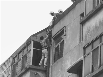 据了解,困在楼上的男子被他人哄骗至一传销窝点,后遭传销组织软禁。该男子趁传销组织人员不备逃到楼顶,又跳至另外一栋楼的五楼,后砸窗进入一户无人居住的人家。由于该户房门反锁,无法出来,只得在窗边呼救。消防人员赶到现场后,立即爬到楼顶利用消防绳和消防腰带成功将被困男子救出。