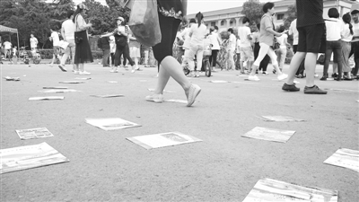 7日下午,在枣庄第十六中学门前,不少商家将手中的宣传单塞到走出校门的考生手中,而仍处在紧张状态中的考生们显然无暇顾及,随手将宣传单丢在地上。有些宣传单被风吹起,落在附近的绿化带中,很难清理。 (记者 王龙飞 摄)