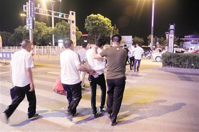 21点08分,何某下车,在BRT站台出站口与高某进行联系,接着,何某举起左手向北指,示意民警。在BRT站台北侧某银行门口,一辆出租车停靠路旁,从车上下来两名身穿白衬衫黑裤子的高瘦青年,其中一名向何某招手,何某随即向他走去。21点15分,便衣民警通过马路,从两侧进行包围,将两名青年迅速控制住并带回文化路派出所。