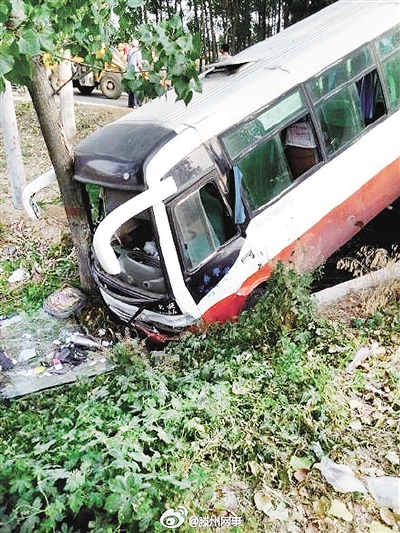 晚报讯 (记者 王龙飞 摄影报道)近日,滕州市东郭镇西坞沟村附近发生一起车祸。在该村附近一路口处,一辆由南往北行驶的客车与一辆由西往东行驶的黑色汽车发生碰撞,客车冲进路边沟渠撞到树上,前挡风玻璃被撞碎,黑色汽车车头及右侧车身受损。目击市民表示,事故未造成人员伤亡。