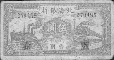 印钞厂迁至崔虎峪后,制版工作仍由总行负责,总行设计制好后,辗转拿到印钞厂印刷。辅币的图案十分具有鲁南特色,其中伍角纸币的正面为深绿色,背面为紫红色,左边山景、火车,两边印有“鲁南”字样,右下方是1944。同年的伍元纸币图案,正面红色,背面蓝色,主图轮船、火车,正下方有“鲁南”和“中华民国三十三年”字样。鲁南多山不必说,设计者还将枣庄中兴煤矿公司主要运输工具火车、轮船设计到纸币的图案中。至于印有“鲁南”字样的伍元北海币,是否是崔虎峪印钞厂所印,还有待于进一步考证。
