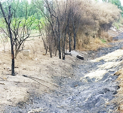 15日,在市中区光明路街道丁庄村,因为有人偷烧麦茬,地边的小树遭了殃,几十棵果树被烧死。 (本报记者 摄)