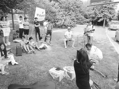 近日,“枣庄阳光音乐社”的成员们在薛城区临山公园的草坪上举行了第一次成员聚会。“枣庄阳光音乐社”的一位成员表示,希望热爱唱歌与乐器的朋友加入社团,以歌会友,用音乐的方式来促进交流。 (实习生 王翊宇 记者 马帅 摄)