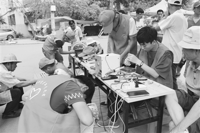 6月14日,枣庄学院家电维修协会的青年志愿者们来到市中区文化路街道便民服务中心前的小广场,立新社区及其周边的居民们纷纷把家里“罢工”的小家电拿来维修。一天下来,被志愿者们维修好又重新“上岗”的小家电近30件,受到了居民群众的一致称赞。 (记者 刘一单 摄)